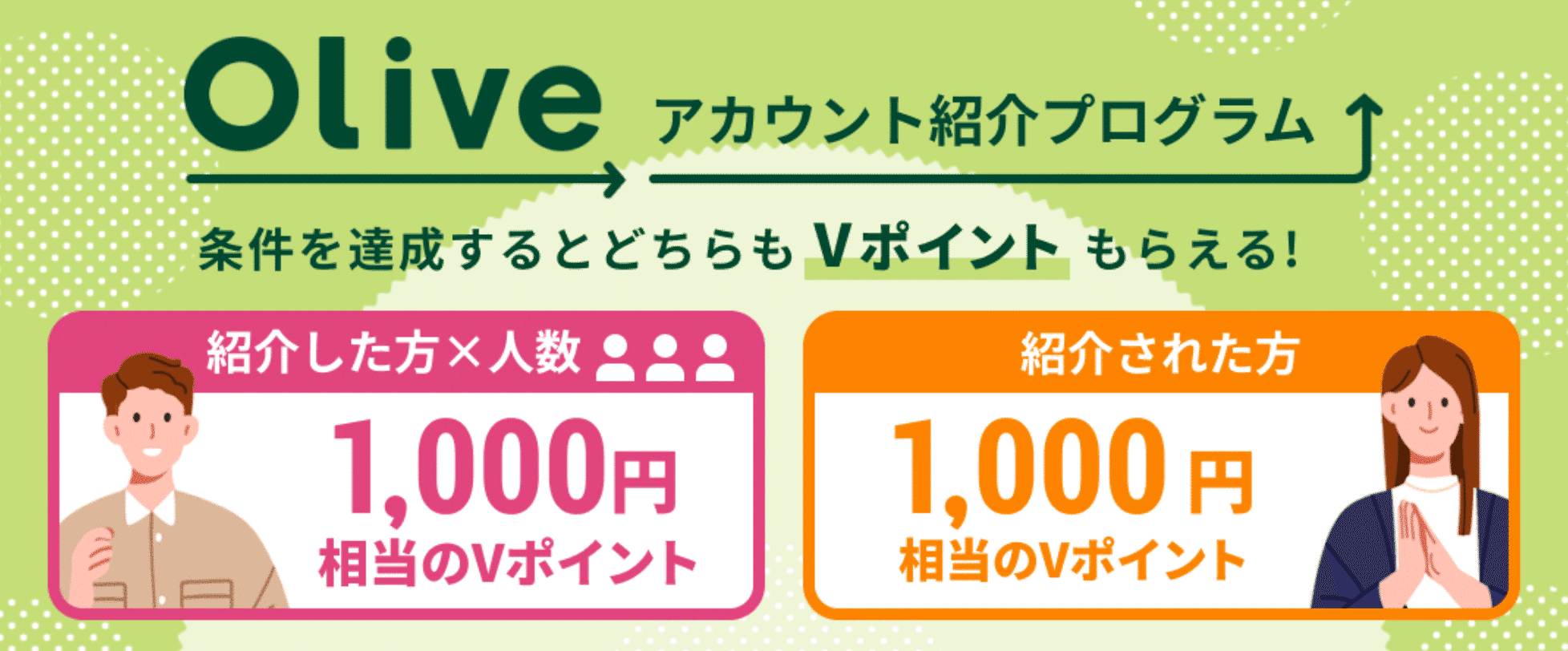 Oliveの紹介コードを友人が使って申し込み、所定の条件を達成すると、紹介者・被紹介者の双方に1000円分のVポイントがプレゼントされる制度です。