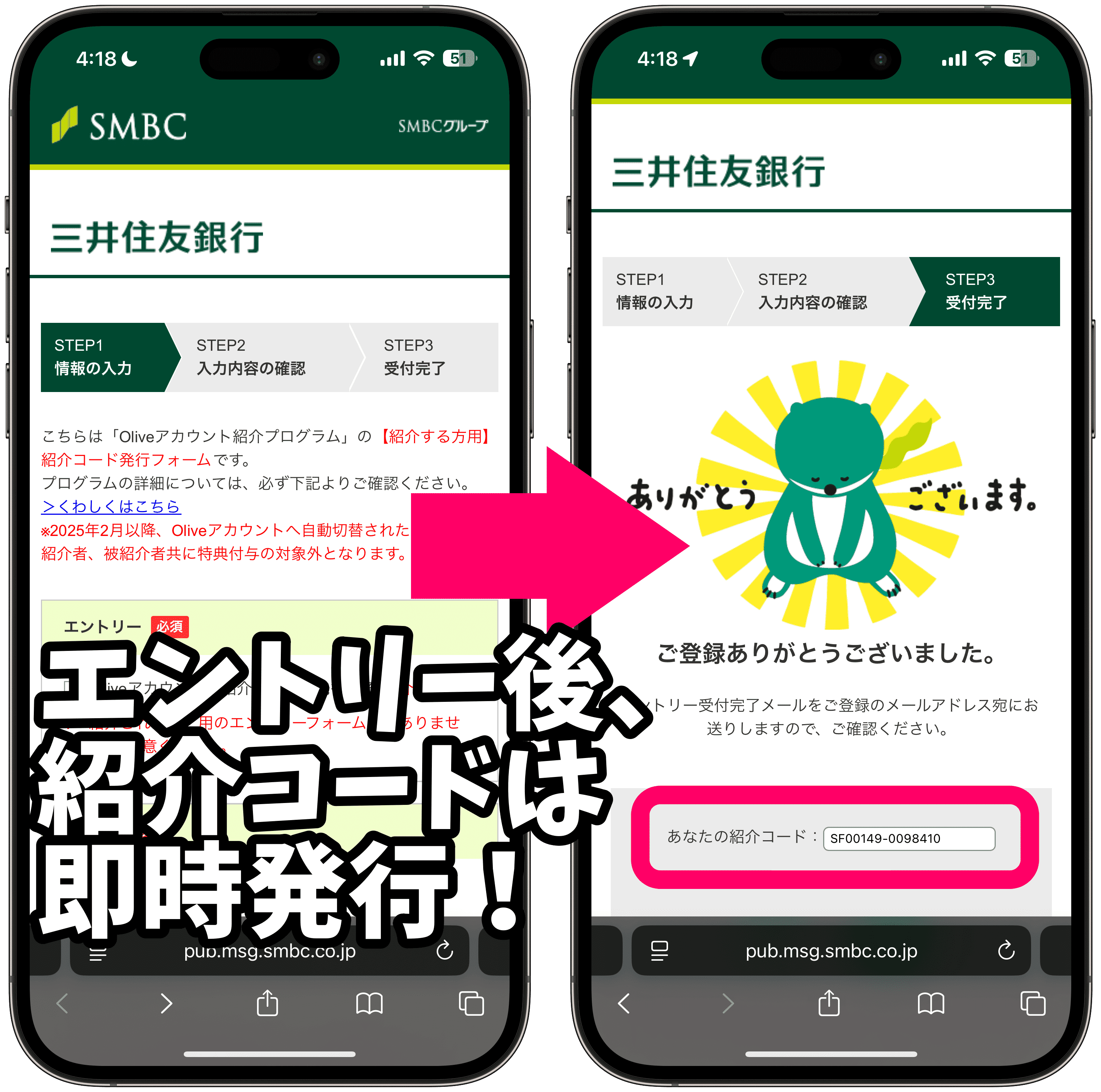 Oliveアプリ下部のバナー、もしくはこちらのOlive公式ページからエントリーし、氏名やメールアドレスなどを入力すると、すぐに紹介コードが発行されます!