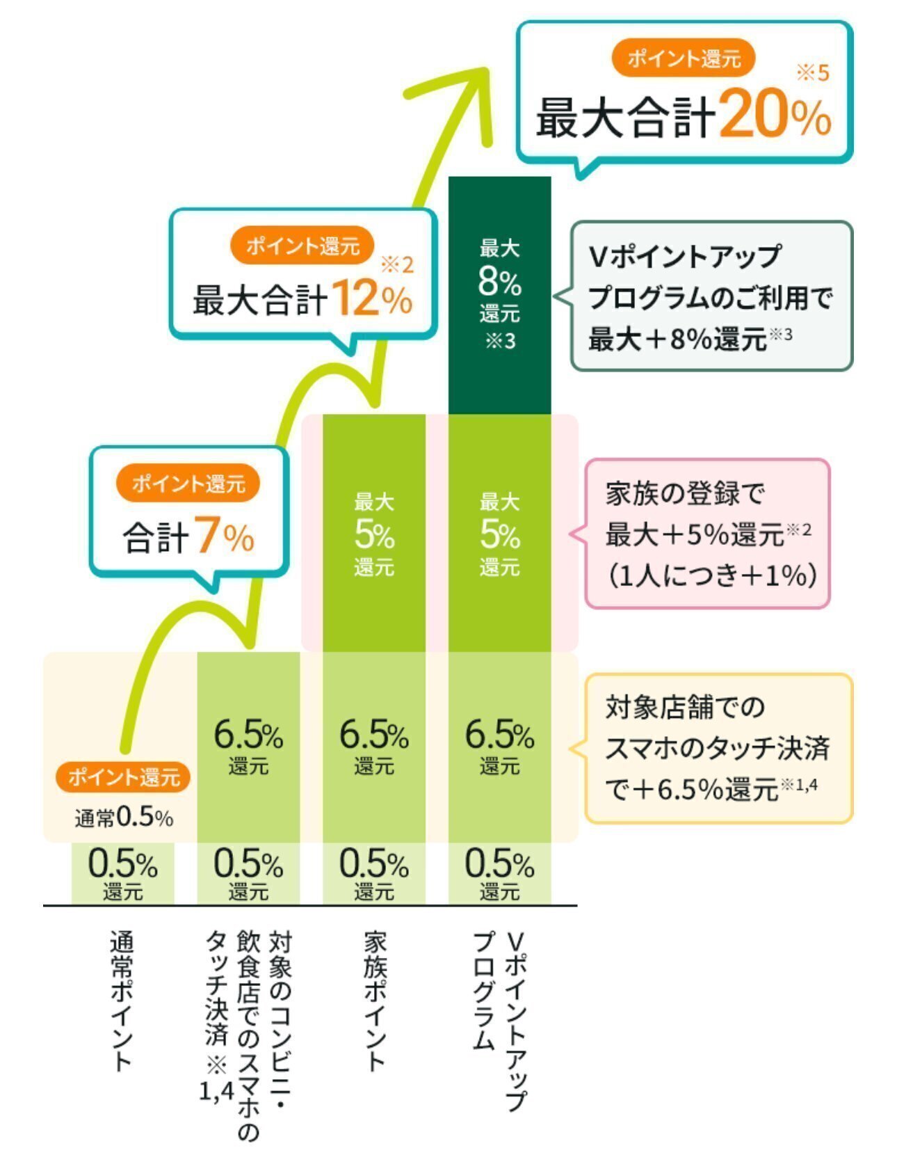さらに家族ポイントやVポイントアッププログラムを併用すると、最大20%のVポイント還元が得られ、ザクザク、ぶいぶいVポイントが貯まります。