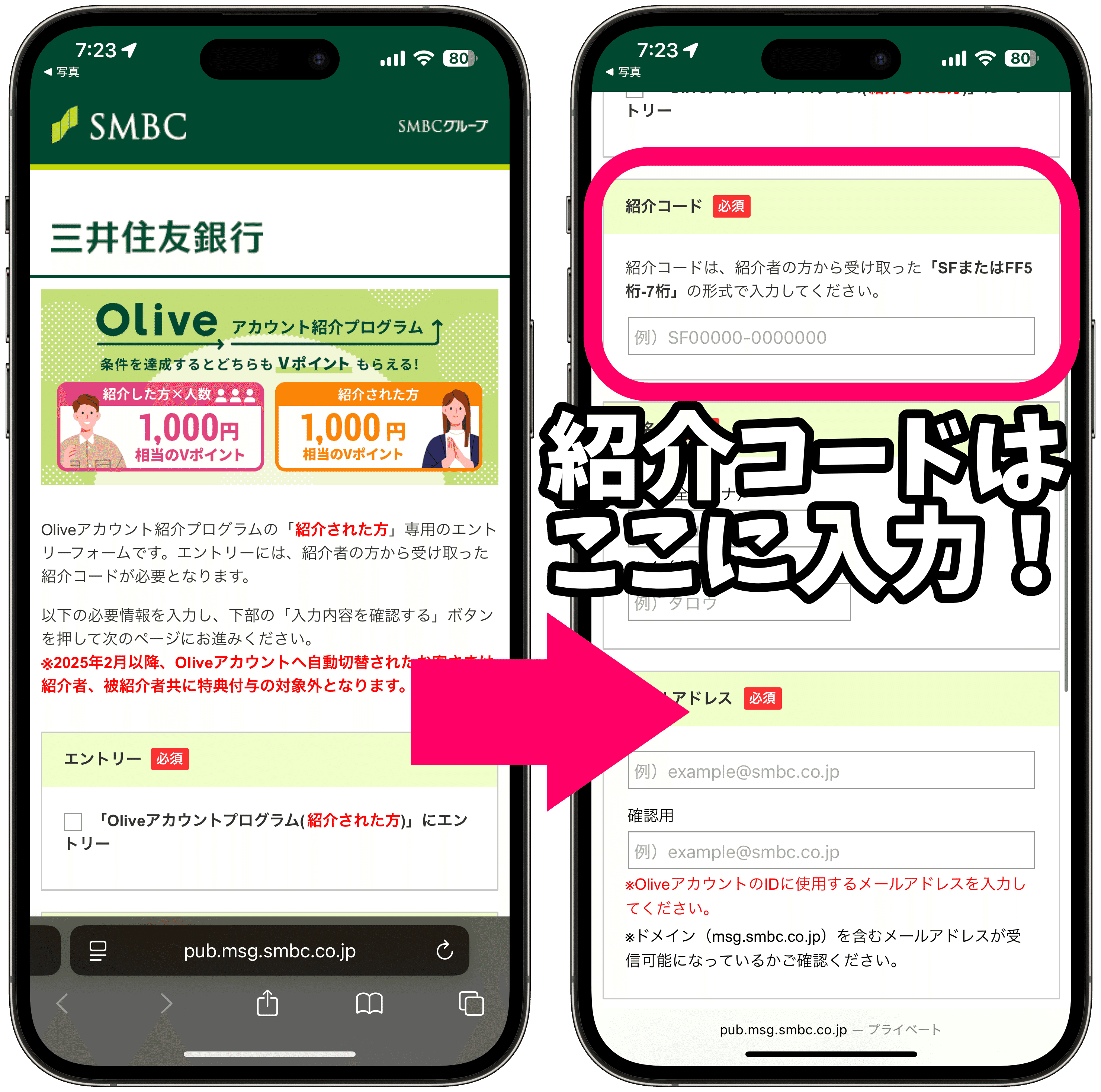この紹介コードを入力してOlive口座を申し込むと、1,000円分のVポイントがもらえるワン!