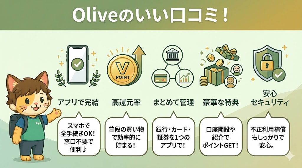 Oliveの良い口コミでは「スマホ完結で手軽」「ポイント還元率が高い」「サービスを一括管理できる便利さ」が多く挙げられていました。さらに、口座開設や紹介キャンペーンの特典、セキュリティの安心感も評価されています。