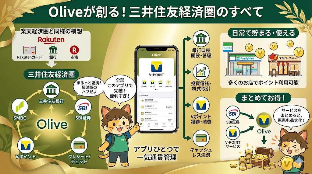 Oliveは三井住友銀行が満を持して展開する金融プラットフォームであり、SBI証券やVポイントと連携することで、グループ全体の経済圏を強化する中心的な役割を担っています。