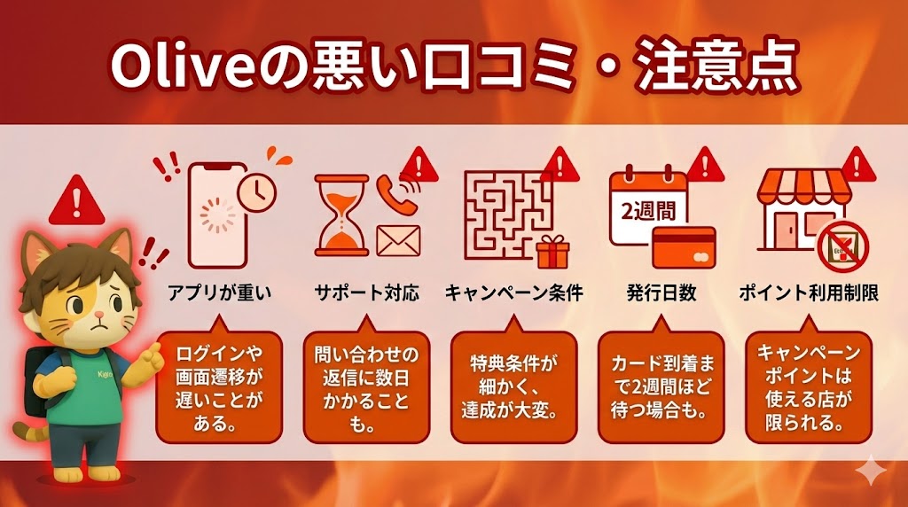 Oliveは非常に多機能でお得なサービスですが、まだ新しいサービスであるためサポート体制や利便性において今後の改善に期待する面もあります。
